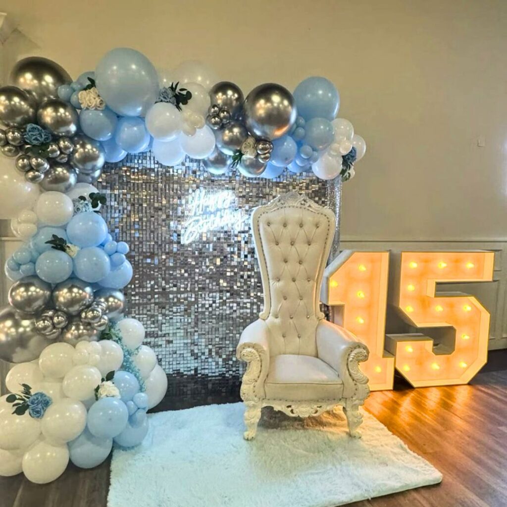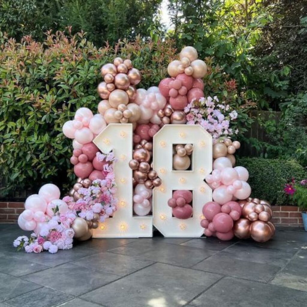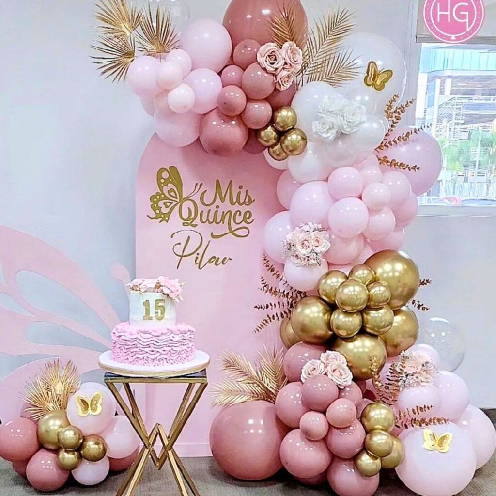 Agrega: globos con helio extra, figuras especiales, números gigantes, letras con luces, peluches, mesas dulces y más.